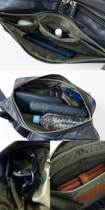 前面ファスナーポケット 深さ11.5cm、口幅9cm、11cm、11cmの3分割ポケットが付いています。 ワイヤレスイヤホンやリップクリームなど細かな物を小分けに入れる事が出来ます。 内装前面 深さ12cm、口幅12cmのポケット×2、ペン差し×2。 こちらの分割ポケットはスマホも入るサイズです。 内装背面 口幅20cm深さ11cmのファスナーポケット×1、キーホルダー収納用ホック×1。 ファスナーポケットには二つ折り財布や通帳など、貴重品収納にピッタリです。 キーホルダーホックはダブルリングも付属しているので、お手持ちの鍵に通せば鍵収納としてご活用いただけます。 ボディバッグですがマチをたっぷり取ってあるのでペットボトルや折りたたみ傘、長財布も同時に収納可能。 またタブレットなどの端末も入れる事が出来ます。