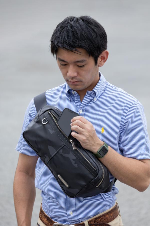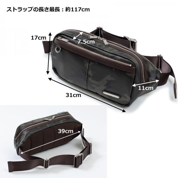 Amazonでご購入の場合はコチラ! 楽天市場でご購入の場合はコチラ! 前後で身頃の形が違うパターンのボディバッグです。 メイン素材にシレー加工を施した迷彩柄ナイロン生地を使用、表面は撥水性があります。 ショルダーテープは光沢のあるナイロンテープ、ガチャバックル付きです。 オリジナルロゴプレート付きです。 本体素材:迷彩柄ナイロン(シレ-加工)全2色 裏地:ナイロン(テフロン加工)カーキ 付属革:牛革(本体グレーにはブラックの革、本体カーキにはブラウンの革) 金属:ニッケル古美色 サイズ:サイズ:横幅(前)31cm/横幅(後)39cm×高さ17cm×マチ幅(上下)7.5cm/マチ幅(左右)11cm ストラップ長さ最長:約117cm 本体重さ:約450グラム 原産国:日本(自社工場)