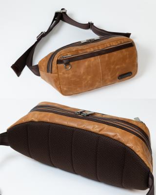 このボディバッグは前面、背面でパーツの形が異なります。 前面は緩やかなカーブの長方形、背面はラグビーボールのような楕円形の形をしています。 前後でパーツの形を変えることでマチが独特のフォルムを形作り、特徴的なデザインを生み出しています。 最近では、人混みを避けるため自転車通勤を始めた方も多いと思います。 このボディバッグはモダンなデザインで、カジュアルウェアから少しカチッとしたジャケットスタイルまで、オンの日もオフの日もご活用頂けます。 本体のファスナーは、YKKの高強度ビスロンファスナー「METALUXE® Tough」を使用しました。 このファスナーは鞄向けに開発され、見た目は金属のようですが金属ファスナーよりも軽量、かつ高強度となっております。動きも滑らかで、金属ファスナーに無い特性を持ち備えています。 ストラップ長さ調整にはガチャバックルを取り付けました。 バックルは鞄を背負った際、胸元で存在感を放つ箇所なので、重みのある物を選びました。 またストラップには袋状に織られた綾織りのナイロンテープを使用しています。 1枚で織られた物と比べると厚みが有り、鞄本体の存在感に負けないテープです。 体に当たる面はメッシュ素材を使用しているので通気性があります。 メッシュ素材の下にクッション性のある芯材を入れ、凹凸を出すためのステッチを入れているので、背負った際の負担を軽減します。