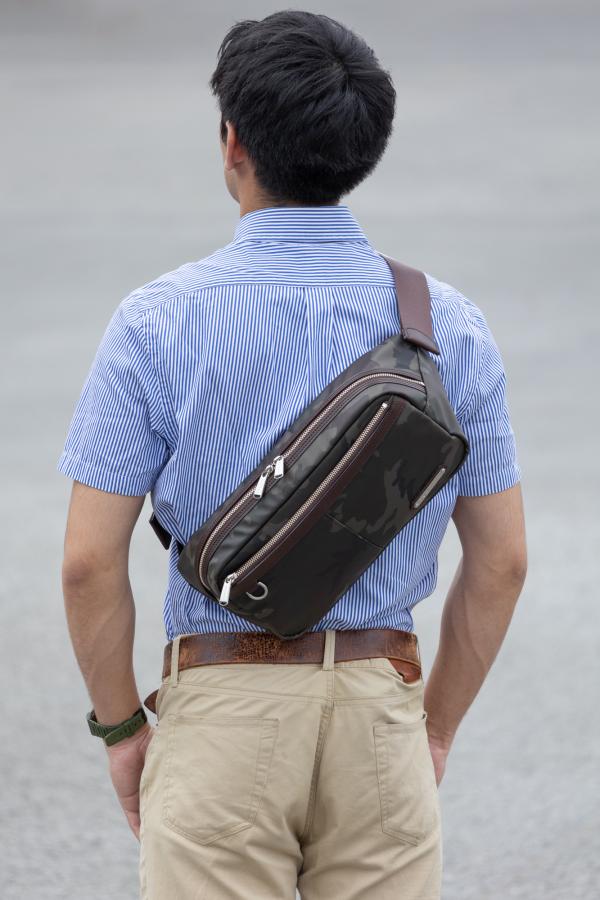 Amazonでご購入の場合はコチラ! 楽天市場でご購入の場合はコチラ! 前後で身頃の形が違うパターンのボディバッグです。 メイン素材にシレー加工を施した迷彩柄ナイロン生地を使用、表面は撥水性があります。 ショルダーテープは光沢のあるナイロンテープ、ガチャバックル付きです。 オリジナルロゴプレート付きです。 本体素材:迷彩柄ナイロン(シレ-加工)全2色 裏地:ナイロン(テフロン加工)カーキ 付属革:牛革(本体グレーにはブラックの革、本体カーキにはブラウンの革) 金属:ニッケル古美色 サイズ:サイズ:横幅(前)31cm/横幅(後)39cm×高さ17cm×マチ幅(上下)7.5cm/マチ幅(左右)11cm ストラップ長さ最長:約117cm 本体重さ:約450グラム 原産国:日本(自社工場)
