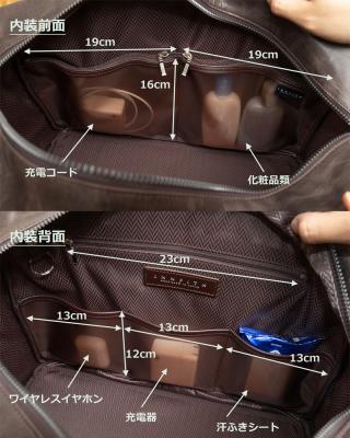 裏地は光沢のあるポリエステル生地を合わせました。 ジャガード織りでヘリンボン柄を表現しているので、光の角度により色味が変わり、高級感があります。本体ブラックにはダークネイビー色、本体キャメルとブラウンにはブラウン色の裏地を合わせています。 裏地にさりげなくブランド名「INNFITH(インフィス)」の箔押しネームを入れていますので是非ご覧下さい。 普段使い慣れたビジネスバッグ等と違い、旅行等で使用する機会が多い事を想定し、「どのポケットに何が入っているか」すぐ分かる様、ポケットをメッシュ素材に致しました。 ポケットの配置にもニーズを取り入れ、使い勝手が良いように前後にポケットを配置しました。 【メイン収納・内装前面】 内装前面には19cm幅分割ポケットがあります。深さが16cmあるので、携帯用シャンプーなどの化粧品などがちょうど収まります。 口幅は広めですがファスナーが付いているので、鞄の中でポケットの中身があばれる事もありません。 【メイン収納・内装背面】 内装背面にはファスナー付きポケットと口幅13cmのポケットが3つ。こちらのファスナー付きポケットは透けない構造ですので、財布など貴重品を収納するのにピッタリです。 3分割ポケットにはワイヤレスイヤホンやポケットティッシュなど、小さめの小物などを分けて収納すると便利です。 バッグの両サイドにもポケットが付いています。 外ポケットは厚みがあるので、制汗剤スプレーなどボリュームがある物も入ります。 たっぷりサイズのボストンバッグなので、着替えに化粧品、本にカメラに折りたたみ傘に飲み物...と、2泊3日程度の旅行の荷物はスッキリまとまって入ります。 また旅行以外でも、ゴルフなどでもご活用頂けます。