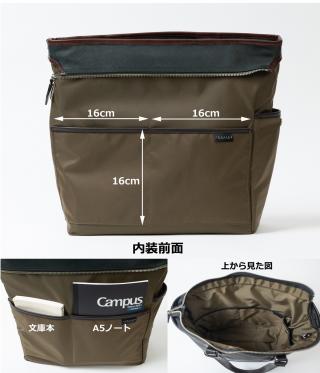 内装前面には幅16cm深さ16cmのポケットが2つ。 幅を広く取ってあるので、A5サイズの電子書籍タブレットや長財布、文庫本などが入ります。 内装背面には幅23cm深さ22cmのファスナー付きポケットが一つと、 深さ11cm、幅がそれぞれ12cm・12cm・10cmの三分割ポケットが付いています。 ファスナー付きポケットには貴重品を入れるのにピッタリ、長財布も入るサイズです。 分割ポケットは充電コードや二つ折りの財布、スマートフォンやUSBメモリ、リップクリームなど小物の収納に適しています。