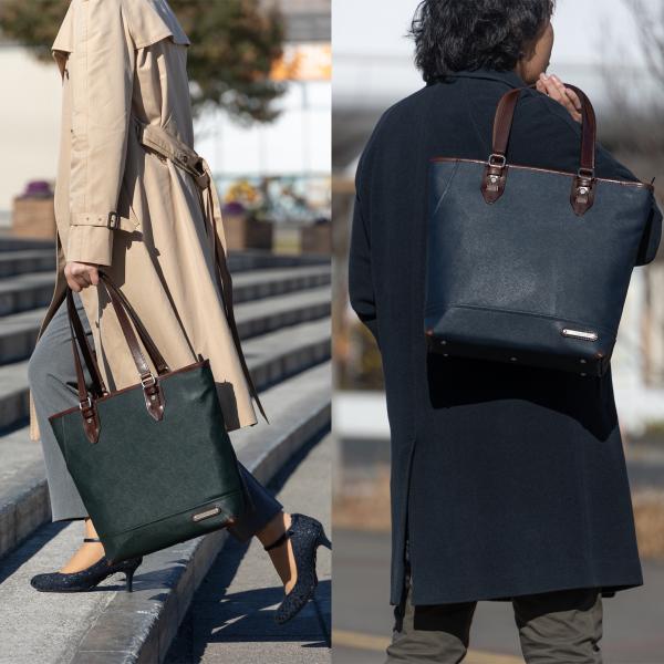 Amazonでご購入の場合はコチラ! 楽天市場でご購入の場合はコチラ! クラウドファンディングサイト【Makuake】にてご支援を頂き製品化しました!詳しくはこちらをご覧下さい! 鞄を選ぶ際、重さは重要な項目です。 荷物を入れて重さが増すのに、鞄本体が重たい...こんな鞄を使っている方も多いのではないでしょうか。 長年、鞄作りに携わってきた野崎製作所だからこそ、軽量にこだわりたい。 見えない工夫をたくさん施し、軽さをとことん追求した鞄を考案しました! トートバッグは縦長のシルエットになっています。その理由はひざの上に収まるサイズに設計したからです。 トートバッグの横幅は40cm、これは女性の膝の上に収まるサイズです。 以前、弊社の鞄をご愛用頂いている女性のお客様より、「使っているトートバッグの横幅が大きくて電車の座席に座ると邪魔になる」というご意見が有り、トートバッグの横幅を縮めるお直しをした事がありました。 その経験を参考に、女性でも持ち運びやすいサイズ、かつひざの上に収まるサイズにと調整を進め、このサイズになりました。 トートバッグを地面に置く方もいらっしゃるかとは思いますが、今のご時世を考えると出来れば避けたい所です。 このトートバッグであれば地面に置くことも無くスマートに乗車が可能です。 本体にはPUコーティングを施した8号帆布生地を使用しています。 コーティングの柄は海外ブランドでも人気のサフィアーノ調を採用しました。 サフィアーノ調とは細かな格子状のシボ模様で、まるで本革のような見た目を演出しています。 PUコーティングには撥水性もあり、少しの水や汚れは簡単に弾きます。 急な雨でも、サッと拭き取るだけでOK!本革と違って表面に水シミができる事もありません。 付属には牛ヌメ革を使用しております。 本体ブラックには黒の牛革、 本体ネイビー、グリーンには茶の牛革を使用しております。 持ち手や口元、底の角など摩擦や動きが多い箇所には本革を使っているので、丈夫で長くご愛用頂けます。 ヌメ革ですので、使えば使うほど馴染み、経年変化をお楽しみ頂けます。 本体素材:合成皮革(PUコーティング) 裏地:ナイロン/カーキ色 付属革:牛本革(ブラック→ブラック、ネイビー/グリーン→ブラウン) 金属:ニッケル古美色 サイズ:横幅(上)40cm/横幅(下)31cm×高さ33cm×マチ幅12cm 持ち手立ち上がり:25cm 本体重さ:700グラム 原産国:日本 どのくらいの荷物が入るのか?サイズ感など、動画でご紹介しています。 YouTubeチャンネル是非ご覧下さい!