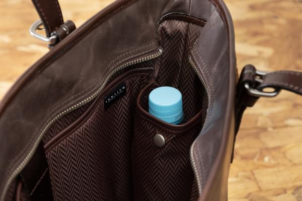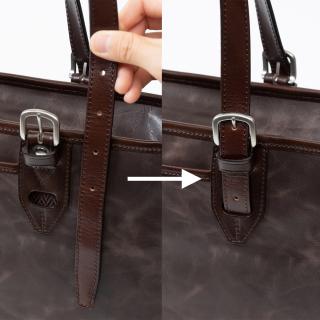 めずらしい!剣先収納 トートバッグの持ち手は4段階に調節可能です。 手持ちで使う時は短めに、アウターを着込む冬場は長めになど、用途に合わせて調節して下さい。 革製品をお使いの方なら経験があるかもしれませんが、長さが調節出来る革ベルト、余った部分がだらしなく見えたり、丸まってきてしまった事、ありませんか? そのような事が無いよう、ベルトの剣先部分は収納出来るようになっています。 収納して使う事で革が丸まってしまうのを防ぎ、トートバッグの見た目が損なわれる心配もありません。 本体のファスナーは、YKKの高強度ビスロンファスナーを使用しました。このファスナーは鞄向けに開発され、見た目は金属のようですが金属ファスナーよりも軽量、かつ高強度となっております。動きも滑らかで、金属ファスナーに無い特製を持ち備えています。防犯、ホコリよけとしてファスナーは閉めてお使い下さい。 ファスナーの引き手にはさりげなくブランドロゴが入っています。