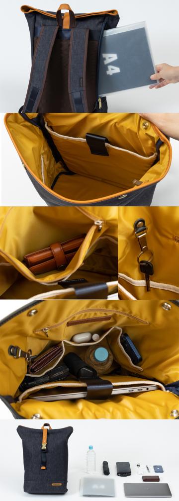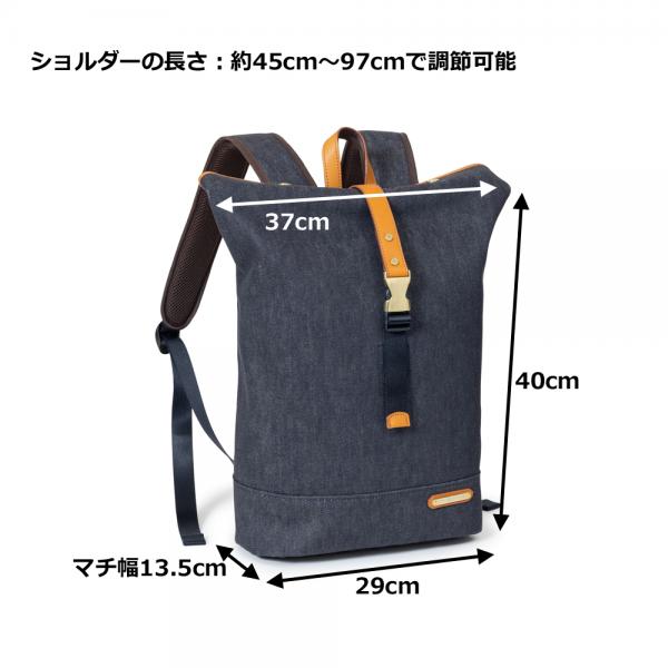 Amazonでご購入の場合はコチラ! 楽天市場でご購入の場合はコチラ! シンプルなシルエットのロールトップタイプのリュックです。 大きすぎない絶妙なサイズで、男女問わずお使い頂けます。 本体素材に岡山デニムを使用、反応材料で先染めされた糸で織られているので摩擦堅牢度が良く、色落ちしにくい素材です。 デニム生地裏にはPVCコーティングを施しているのでハリがあり、撥水性もあります。 本体素材:コットン100%(岡山デニム) 裏地:ナイロン/イエロー(テフロン加工を施し撥水性に優れたナイロン) 付属革:牛本革(ブラック/キャメルの2色) 金属:本体ブラック→ニッケル古美色 本体キャメル→真鍮色 サイズ:横幅(上)37cm/横幅(下)29cm×高さ40cm×マチ幅13.5cm ショルダーの長さ:約45cm〜97cmで調節可能 本体重さ:約750グラム 原産国:日本(自社工場)