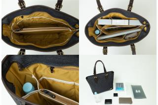 裏地はデニムパンツのステッチをイメージしマスタードカラーを採用。中のヘリも赤耳イメージで生成りにしています。 中には特徴的な仕切りと分割ポケットが多数。普段からトートバッグを使用していて、中に入れたものがゴチャッとしたり、書類を入れるスペースが無い...なんて経験ありませんか?それらを解決したのがこのトートバッグです。 真ん中に仕切りが付いているので、スッキリとファイルを立てて収納する事が可能です。仕切りに付いているファスナーは、iPadが丁度良く入るサイズ(横幅31cm×深さ20cm)になっております。 ペットボトルを立てて入れる事が出来る専用ポケットも付いています。