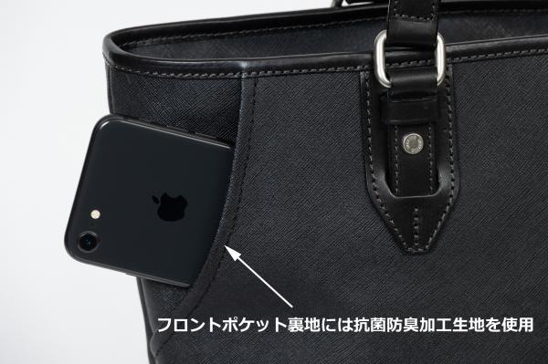 サイドにはペットボトルを立てて入れられるホルダーも付いています。 ペットボトル以外にも折りたたみ傘などを立てても便利です。 ホルダーは使わないときはホックで留めておけるので邪魔になりません。 背面上部にはキーホルダーを取り付けるのにピッタリなフックも付いています。 鍵を引っかけておけば無くす心配もありません。 口元にはファスナーが付いているので、街中や電車の中でも気にすること無く鞄を持ち歩けます。 ファスナーはYKK製品を使用しています。フタが閉まるので、ホコリなど細かな汚れが入るのを防ぐ役割もあります。 表の向かって左上には緩やかなカーブが特徴のポケットが一つ。 トートバッグを肩に掛けている状態でも使いやすいように設計しました。 フロントポケットの裏地には抗菌防臭加工を施した生地を使用しています。 この生地は臭いの原因になる菌が繊維上での増殖を抑えることで嫌な臭いを減少させる効果があります。 肌に触れることが多い衣料品、タオル、シーツ、マットなど身の回りの製品に使用されている生地です。 普段手に触れることの多いスマートフォンやマスクなどを収納するのにピッタリなポケットです。 またエコバッグなどを収納しても、とっさにすぐ取り出しが出来るので便利です。