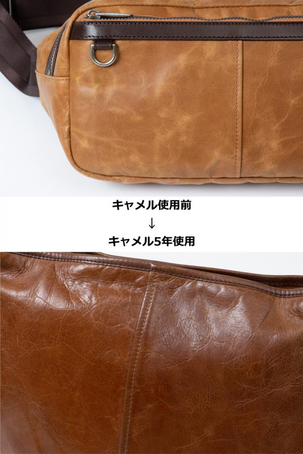 Amazonでのご購入はコチラ! 楽天市場でのご購入はコチラ! クラウドファンディングサイト【BOOSTER】にて20名様、475,700円のご支援を頂き製品化しました!詳しくはこちらをご覧下さい! 東京の鞄メーカー発ブランド「INNFITH(インフィス)」が提案する本革ボディバッグ。 姫路で鞣(なめ)されたレザーは上質な質感。 丈夫で使う度手に馴染み、3年後、5年後と長くお楽しみ頂けます。 たっぷり収納でカジュアルからビジネスまでOK!自転車通勤などにもオススメ。 風格を高めて大人の移動を演出します。 本体のレザーは北米原皮、姫路のタンナーで鞣された「バレッサ供廚鬟船腑ぅ垢靴泙靴拭 この革は表面を軽く擦り、150度という高温のアイロンでWAXを浸透させた事によりきめ細やかな肌面が特徴の革です。鞣しの段階でタンニンを使用する事で軽量化も実現、100度の低温アイロンで最終仕上げを行う事で自然のつやを出しています。 市販のワックス、クリームなどを使用する事で艶や色に深みが増し、革に重厚感が増して行きます。 軽いかすりキズ程度であれば、オイルを塗り込む事で目立たなくなるので是非キズを気にせず使って下さい。 お礼のお手紙に、日々のお手入れ方法を記載してお送り致します。 本体に合わせる付属の革も国内鞣しの牛ヌメ革を使用しています。 ワックスを丁寧に塗り込んで仕上げたヌメ革はツヤがあり手触りも良く、こちらも経年変化をお楽しみ頂けます。 本体素材:本牛革 裏地:ポリエステル(ブラック→ネイビー、ブラウン/キャメル→ブラウン) 付属革:牛本革(ブラック→ブラック、ネイビー/キャメル→ブラウン) 金属:ニッケル古美色 サイズ:横幅(前)31cm/横幅(後)39cm×高さ17cm×マチ幅(上下)7.5cm/マチ幅(左右)11cm ストラップ長さ最長:約127cm 本体重さ:550グラム 原産国:日本(自社工場)