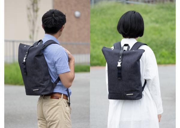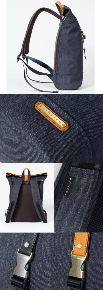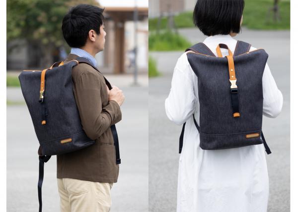 Amazonでご購入の場合はコチラ! 楽天市場でご購入の場合はコチラ! シンプルなシルエットのロールトップタイプのリュックです。 大きすぎない絶妙なサイズで、男女問わずお使い頂けます。 本体素材に岡山デニムを使用、反応材料で先染めされた糸で織られているので摩擦堅牢度が良く、色落ちしにくい素材です。 デニム生地裏にはPVCコーティングを施しているのでハリがあり、撥水性もあります。 本体素材:コットン100%(岡山デニム) 裏地:ナイロン/イエロー(テフロン加工を施し撥水性に優れたナイロン) 付属革:牛本革(ブラック/キャメルの2色) 金属:本体ブラック→ニッケル古美色 本体キャメル→真鍮色 サイズ:横幅(上)37cm/横幅(下)29cm×高さ40cm×マチ幅13.5cm ショルダーの長さ:約45cm〜97cmで調節可能 本体重さ:約750グラム 原産国:日本(自社工場)