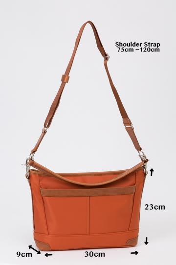 メイン素材: ナイロン(リモンタ社製) 附属:牛革 本体に高密度で光沢感のある上質な素材として有名なリモンタ社製ナイロン、附属には手塗ワックス後にアイロン加工を施した牛ヌメ革を使用した、B5サイズが入りポケットを多数装備した収納力のある、ワンショルダー・斜め掛けと2WAYで使用できるショルダーバッグです サイズ 横幅30cmX高さ21cmX厚幅(マチ)9cm 日本製 重量:600g