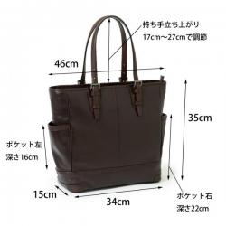 A4サイズの書類が余裕で出し入れ出来るサイズで中にはポケットが多数、物を収納しやすい構造になっています。 バッグ両サイドのポケットはリニューアルにより深さを変えました。 向かって右のポケットは深さ22cm、ペットボトルや折りたたみ傘など長さがある物を収納出来ます。 向かって左側のポケットは深さ16cm、浅いのでスマートフォンなどよく使う物も出し入れがスムーズです。 メインファスナーには、YKK社製最上級ファスナー“EXCELLA”エクセラ(エレメントひとつひとつに磨きをかけた滑らかなファスナー)を使用しています。 ファスナー、金具類はブラックニッケル色です。 持ち手の長さは4段階で調整可能、以前のモデルよりも持ち手を長くしたので、冬場のアウターを着込む時期でも肩掛けでお使い頂けます。 5箇所打ち込んである底鋲は、直置き時、鞄を保護する役割を果たします。