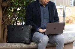 内装背面には幅23cm深さ18cmのファスナーポケットが1つと、深さ11cm幅14cmのポケットが2つとペン差しが2つ。長財布はファスナーポケットにも収納可能です。 分割ポケットには名刺入れやメモ帳、ペンなど細かな物を仕分けて入れる事が出来ます。 サイドにはペットボトルを立てて入れられるホルダーも付いています。 ペットボトル以外にも折りたたみ傘などを立てても便利です。 ホルダーは使わないときはホックで留めておけるので邪魔になりません。 背面上部にはキーホルダーを取り付けるのにピッタリなフックも付いています。 鍵を引っかけておけば無くす心配もありません。 ノートPCはもちろんファイルやタブレット、文庫本や名刺入れなど、ビジネスに必要な物は全て収納する事が出来ます。 口元にはファスナーが付いているので、街中や電車の中でも気にする事無く鞄を持ち歩けます。 ファスナーはYKK製品を使用しています。フタが閉まるので、ホコリなど細かな汚れが入るのを防ぐ役割もあります。 鞄正面の中央にはフロントポケットが付いています。 こちらのポケット裏地にはトートバッグと同様、抗菌防臭加工を施した裏地を使用しています。 ポケットの深さは17cmあるのでスマートフォンなど手に触れる物を収納するのにピッタリです。