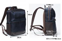 裏地にはテフロン加工を施したナイロン生地を使用しています。 撥水性があるので、水が染み込みにくくなっています。 本体ブラック、ネイビーはネイビー色の裏地、 本体ベージュにはカーキ色の裏地となっております。 リュック背面側の内装には、PC収納ポケットを付けました。 ポケットの前後にクッション性のある芯材を入れているので、大切なPCを衝撃から守ります。 口幅28cmで13〜14インチPCに対応、PC以外にもA4サイズのフォルダーなども入ります。 口元にベルトも付いているので中で暴れません。 ※お使いのPCによっては入らない場合がございます、事前にPCサイズをご確認頂く事をお勧め致します。またPC収納時、地面に衝突するのを防ぐため、ポケットはリュックの底面から少し浮かせた位置に取り付けています。 リュック前面側の内装には、ファスナーポケットと分割ポケットを付けました。 ファスナーポケットは口幅20cm、深さ23cmで長財布など貴重品も入るサイズです。 4つの分割ポケットはそれぞれ口幅14cm、上段ポケットが深さ18cm、下段ポケットが深さ12cmと深さを変えています。 上段の深めポケットにはめがねケースやペンケース、長財布など長さがある物を立てて収納して下さい。 下段の浅めポケットには小銭入れや名刺入れなどを小分けして入れる事が出来ます。 マウスやスマホの充電器などテレワークに必要な物も分けて収納出来て便利です。 A4サイズのクリアフォルダーなども入るサイズなので、お仕事に必要な書類も一式入れる事が出来ます。 ノートやペンケース、PC機器などのガジェットに筆記用具、傘やペットボトルまでスッキリと収納可能です。